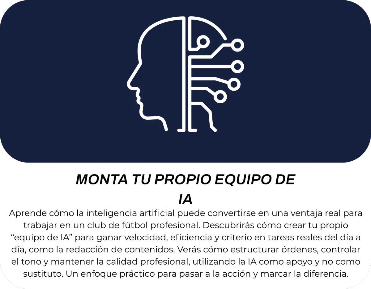 Incluye acceso a todos los módulos grabados, masterclasses mensuales en directo con profesionales del fútbol, acceso a la comunidad privada en Skool y oportunidades de networking con personas del sector.